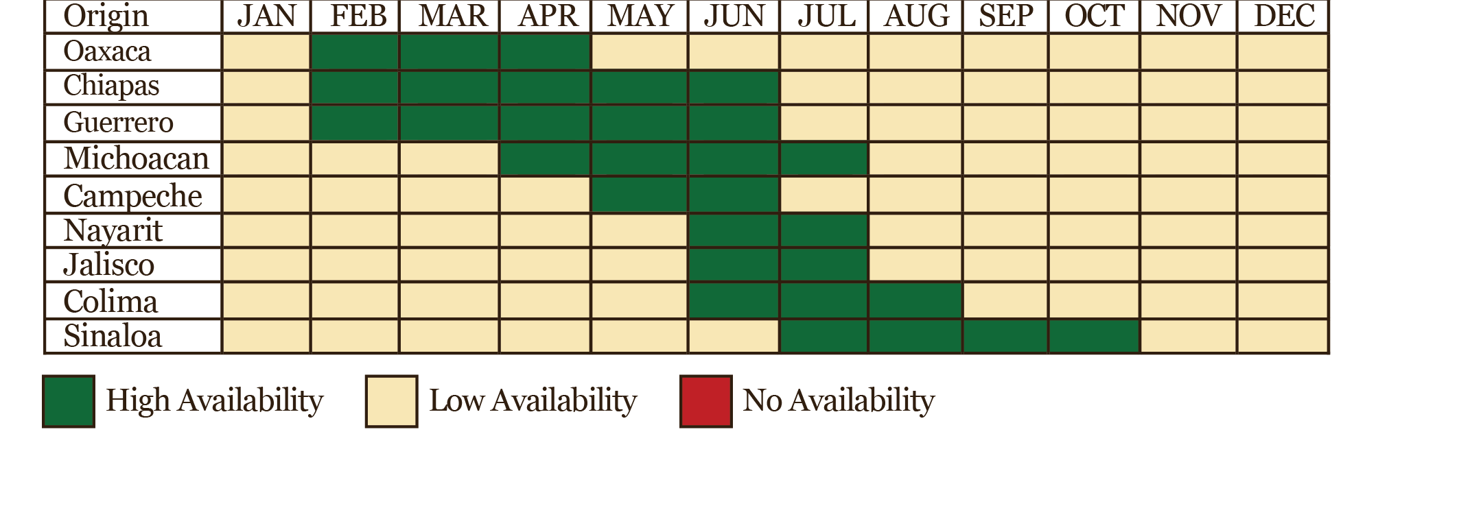 Produced in Mexico in the states of Oaxaca, Chiapas, Guerrero, Michoacan, Campeche, Nayarit, Jalisco, Colima, and Sinaloa.