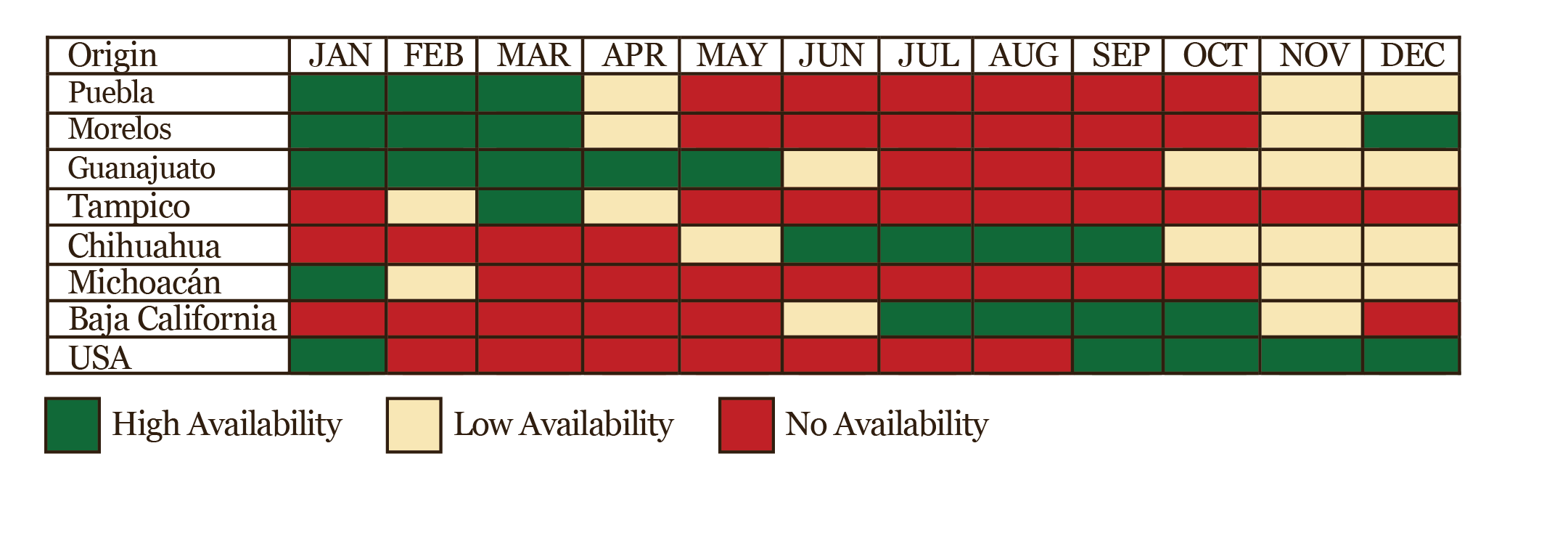 Produced in Mexico in the states of Puebla, Morelos, Guanajuato, Tampico, Chihuahua, Michoacán, and Baja California, as well as in the United States.